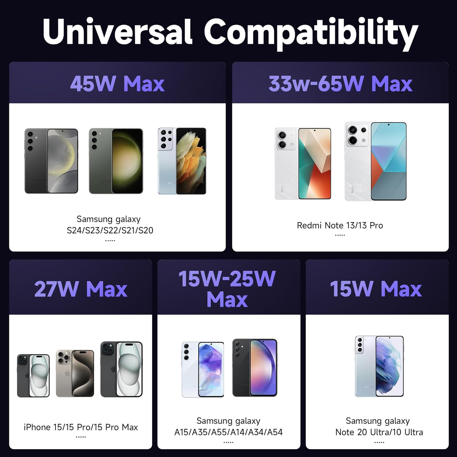 - Widely Compatible Type C Port Models: Widely Compatible with Phones on the market that use Type c interface such as samsung/xiaom/huawei, for example: Samsung Galaxy A15,A14,A40,A53, A55,A54,A25,A34, Galaxy S25 Ultra/S25/S24 Ultra/S24+/S23/S22 Ultra/S21+/S20+/Note 20+/Note 20/Note20+/10+/10e/9/S9/S8/Galaxy Z Flip/3 Fold 3 etc. For Xiaomi Redmi Note 13 Pro/Redmi A2, Google Pixel 9/Pixel 9a/Pixel 8/Pixel 8a/Pixel 7a/Pixel 6, OnePlus 10T 5G/12 5G etc
