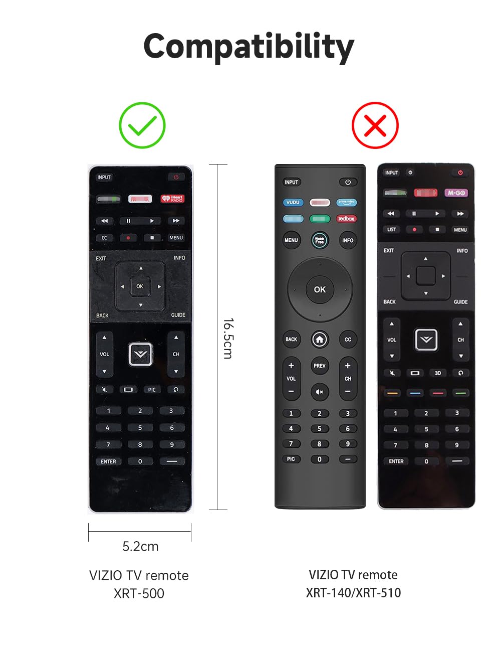- Check the model of the Vizio remote control shell before purchase. Make sure your Vizio XRT500 Smart TV Remote control is identical to the one shown in picture.